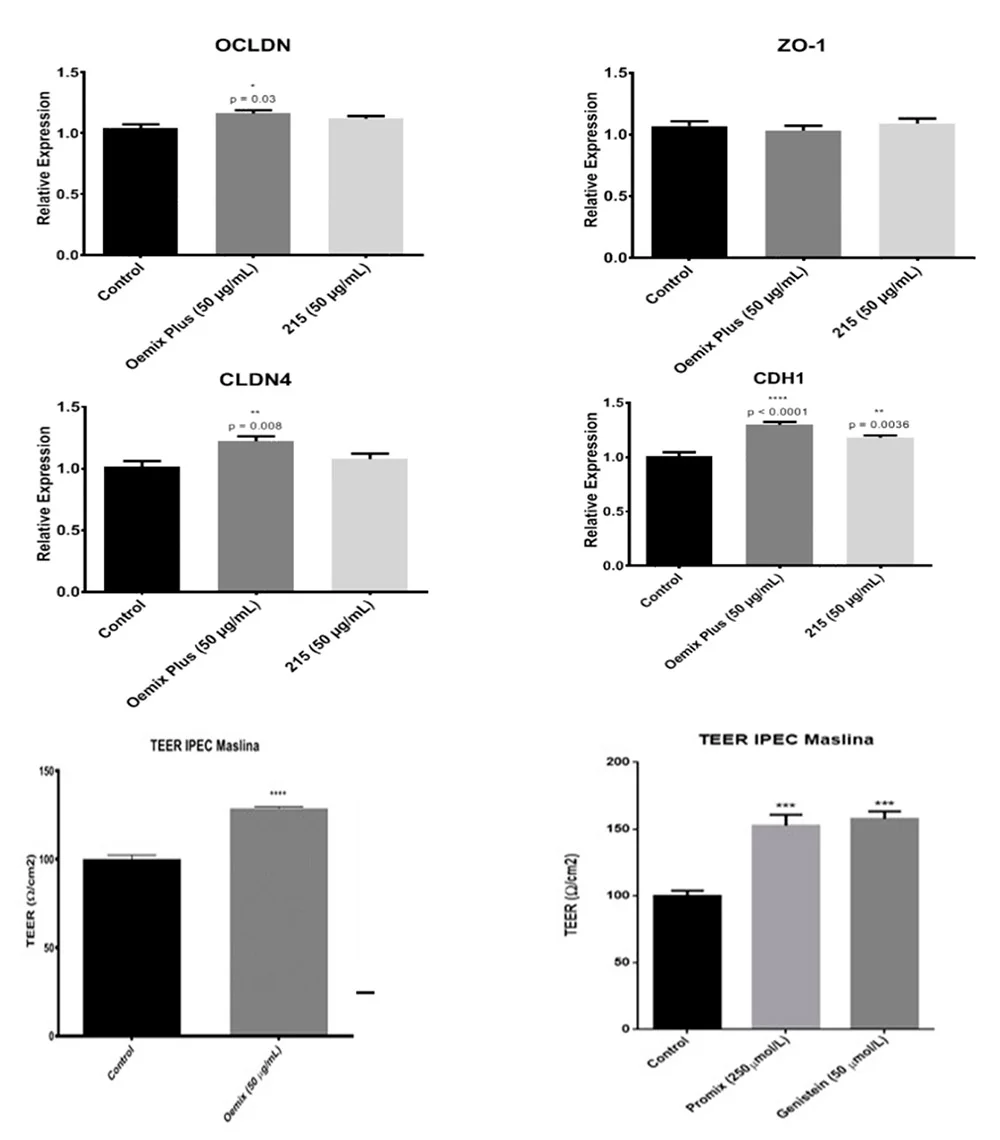 Через 48 часов после посева и дифференциации монослоя применяли различное лечение (Control – Диметилсульфоксид -0.1%; Oemix Plus – терпены; 215 – конкурентная добавка (прим. Control, oemix plus, 215 – это колонки на графиках)). И через 48 часов после добавления лечения измеряется экспрессия генов OCLDN, ZO-1, CLDN-4 и CDH11, а также трансэпителиальным электрическое сопротивлением (TEER) монослоя (прим. Это всё гены плотного соединения). Результаты показывают влияние Oemix® и Oemix Plus (терпены) на барьерные свойства эпителия, это можно увидеть по значительно увеличившейся экспрессии OCLDN, CDH1 и CLDN4. Аналогичным образом, Oemix® и Promix® (полифенолы) вызвали увеличение трансэпителиального электрического сопротивления (TEER) монослоя, что указывает на потенциальную индукцию и пролиферацию клеток, и / или повышенную экспрессию белков, ответственных за плотное соединение.