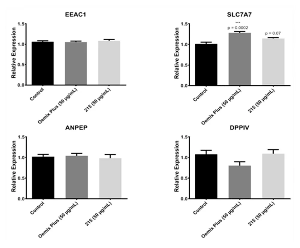 Через 48 часов после посева и дифференциации монослоя применяли различное лечение (Control – Диметилсульфоксид -0.1%; Oemix Plus – терпены; 215 – конкурентная добавка (прим. Control, oemix plus, 215 – это колонки на графиках)). И через 48 часов после добавления лечения измеряется экспрессия генов EEAC1, SLC7A7, ANPEP и DPPIV. Результаты показывают влияние Oemix Plus (терпены) на переносчика аминокислот SLC7A7, значительно увеличивая его экспрессию.