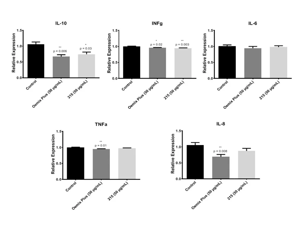 Через 48 часов после посева и дифференциации монослоя применяли различное лечение (Control – Диметилсульфоксид -0.1%; Oemix Plus – терпены; 215 – конкурентная добавка (прим. Control, oemix plus, 215 – это колонки на графиках)). И через 48 часов после добавления лечения измеряется экспрессия генов L-10, INFγ, IL-6, TNFα и IL-8. Результаты показывают, как Oemix Plus (терпены) значительно снижает экспрессию провоспалительных цитокинов (TNFα, INFγ и IL-8). Аналогичным образом, в группе Oemix Plus наблюдается снижение экспрессии противовоспалительного цитокина IL-10 как следствие общего ослабления воспалительного состояния.