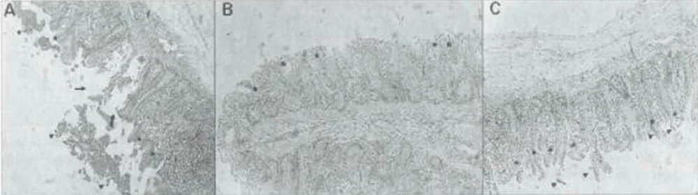 A) Контрольная группа не лечилась. Слепая кишка, где наблюдается разрушение слизистой оболочки и эпителиальных клеток — стрелки — гипертрофия и псевдополипоидные образования ворсинок — звездочки. (B) Группа, получавшая салиномицин. Псевдополипоидные образования — звездочки — и незначительное разрушение ткани слепой кишки — наконечник стрелы. (C) Группа, получавшая биоактивный экстракт оливок, богатый терпенами (OBE). Менее выраженные полиповидные образования, чем в других группах — звёздочки — и отсутствие деструкции ткани слепой кишки. Наблюдается защитный эффект против колонизации и разрушения эпителия, вызванного кокцидиями, как в группе, получавшей салиномицин, так и в группе, получавшей биоактивный экстракт оливок.